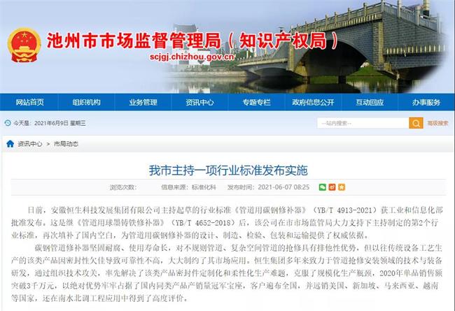 恒生集團始終堅持用標準和創(chuàng )新持續引領(lǐng)行業(yè)發(fā)展,日前,由恒生集團主持起草的行業(yè)標準《管道用碳鋼修補器》(YB/T 4913-2021)獲工業(yè)和信息化部批準發(fā)布。這是繼《管道用球墨鑄鐵修補器》(YB/T 4652-2018)后,恒生集團主持制定的第2個(gè)行業(yè)標準,再次填補了國內空白,為管道用碳鋼修補器的設計、制造、檢驗、包裝和運輸提供了權威依據。