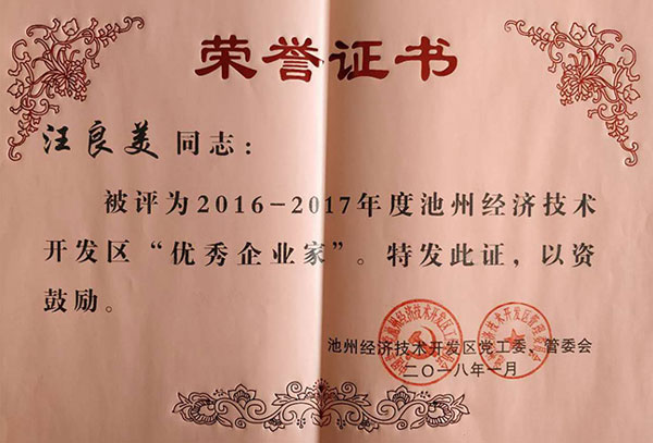 2018年1月31日, 池州市經(jīng)濟技術(shù)開(kāi)發(fā)區召開(kāi)了2018年度工作會(huì )議, 會(huì )議表彰了2017年度開(kāi)發(fā)區優(yōu)良企業(yè)(項目)和優(yōu)良企業(yè)家,恒生集團繼榮獲“突出進(jìn)步獎后又”榮獲“創(chuàng )新發(fā)展獎”,汪良美董事長(cháng)再次被評為2017年度“優(yōu)秀企業(yè)家”。
