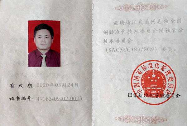 全國鋼標委鑄鐵管分技術(shù)委員會(huì )聘請恒生集團董事長(cháng)汪良美先生擔任鋼標委鑄鐵管分技術(shù)委員會(huì )委員,汪良美先生是多項國家行業(yè)標準和國家標準的主要起草人,多次參加鑄鐵管分技術(shù)委員會(huì )主持的標準審定工作,為各項標準的審定提供了大量有效的意見(jiàn)和建議。